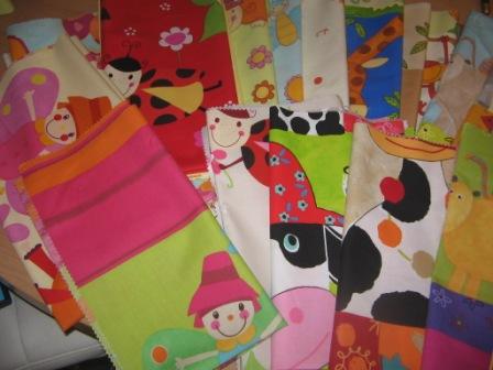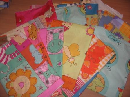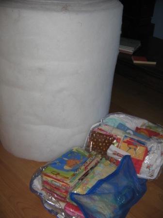 Des tissus magnifiques, du jersey, 5 m de ouate, de l'éponge, du matelassé, etc...Bon le souci maintenant c'est que je manque de petites mains ;)